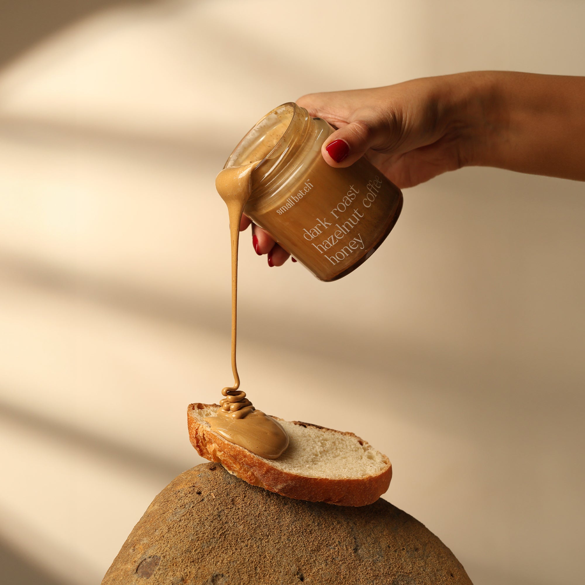 Organic forest honey, roasted Arabica coffee bean powder, hazelnut powder.